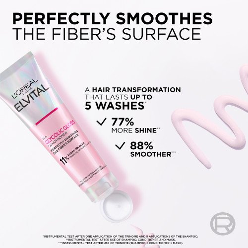 L'Oreal Paris Elvital Glycolic Gloss -hoitoaine elottomille, kiiltoa kaipaaville hiuksille silottaa hiusten pintaa. Elvital Glycolic Gloss- sarja on kiiltoa antava kotona käytettävä hiustenhoitorutiini, jonka tuotteet korjaavat hiuksia, tekevät hiusten kunnosta paremman ja antavat pitkäkestoista kiiltoa. Lopputuloksena 77% kiiltävämmät** ja 88% sileämmät*** hiukset.