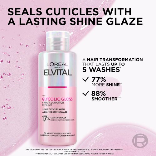 Elvital Glycolic Gloss- sarja on kiiltoa antava kotona käytettävä hiustenhoitorutiini, jonka tuotteet korjaavat hiuksia, tekevät hiusten kunnosta paremman ja antavat pitkäkestoista kiiltoa. Lopputuloksena 77% kiiltävämmät** ja 88% sileämmät*** hiukset.