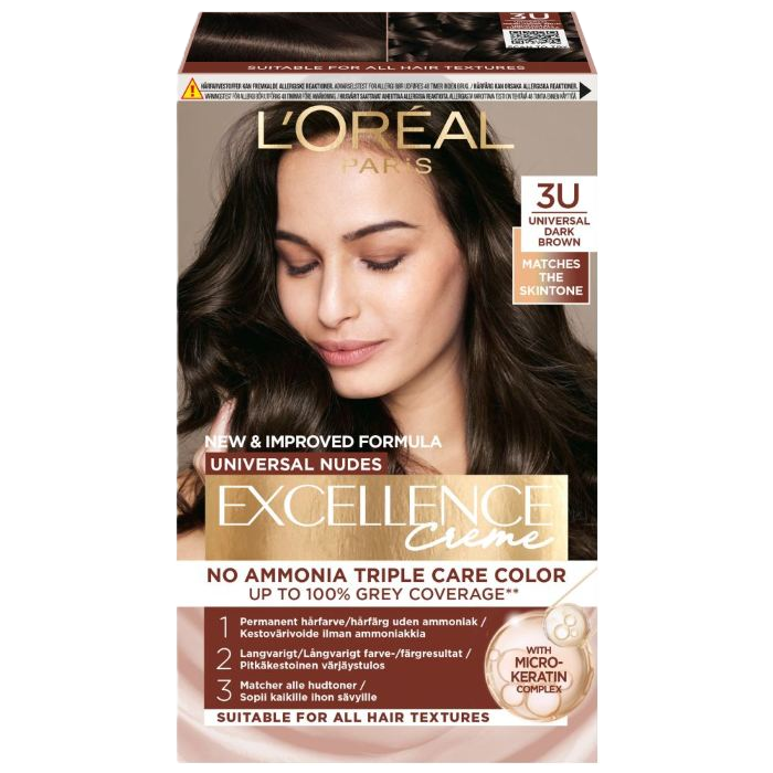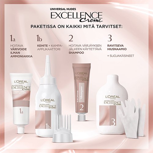 L'Oréal Paris Excellence Universal Nudes on kestoväri ilman ammoniakkia, joka sopii kaikille hiustyypeille. Koostumus sopii kaikille ihon sävyille, ravitsee ja antaa hiuksillesi kiiltoa** sekä peittää harmaat hiukset jopa 100 %*.