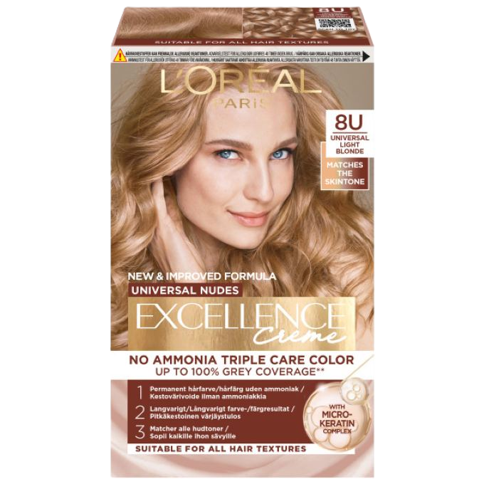 L'Oréal Paris Excellence Universal Nudes on kestoväri ilman ammoniakkia, joka sopii kaikille hiustyypeille. Koostumus sopii kaikille ihon sävyille, ravitsee ja antaa hiuksillesi kiiltoa** sekä peittää harmaat hiukset jopa 100 %*.