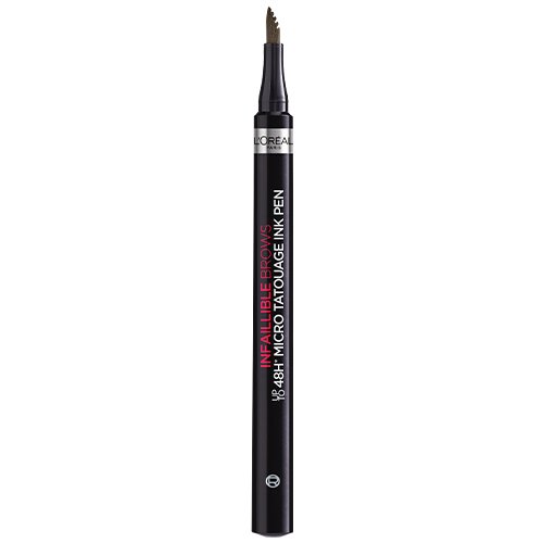 L'Oréal Paris Infaillible Brows 48H Micro Tatouage Ink Pen -kulmakynä auttaa täyttämään kulmia, antaa väriä ja kestää jopa 48 tuntia*. Vedenkestävä koostumus, ei varise tai leviä. Kolmihaarainen sivellin tekee hiuksenhienojen vetojen piirtämisestä helppoa. Huolitellut ja tarkkaan muotoillut kulmat ja väri, joka kestää koko päivän.