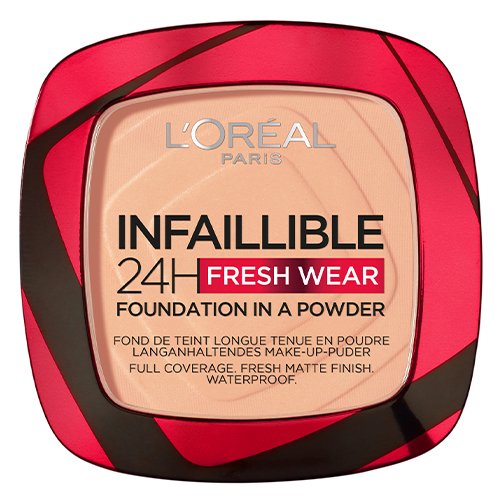 Koe L'Oréal Paris Infaillible 24H Fresh Wear Foundation In A Powder -meikkipuuteri. Meikkipuuteri peittää kuten nestemäinen meikkivoide samalla, kun se antaa iholle mattapinnan paakkuuntumatta. Enemmän kuin pelkkä puuteri! Koostumus sisältää erittäin hienojakoisia pigmenttejä, jotka kiinnittyvät ihoon ja pysyvät koko päivän. Helppo häivyttää ja antaa iholle luonnollisen näköisen, saumattoman ja sametinpehmeän mattapinnan. Saatavana 12 sävyssä, jotka sopivat erilaisille ihon sävyille. Ei tahraa. Hienkestävä. Vedenkestävä. Lämmön ja kosteuden kestävä. Pidennä puuterisi kestoa!