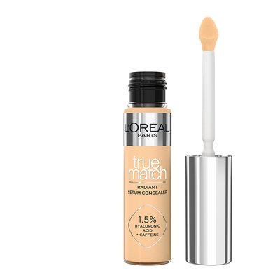 L'Oréal Paris True Match Radiant Serum -peitevoide antaa puolipeittävän/peittävän lopputuloksen, häivyttää tummia silmänalusia ja vähentää silmäpussien näkyvyyttä. Ihon sävyä korjaavia pigmenttejä ja vaikuttavia ainesosia sisältävä ainutlaatuinen hybridituote yhdistää meikin ja ihonhoidon. Peitevoide häivyttää tummia silmänalusia, silottaa juonteita ja vähentää silmäpussien näkyvyyttä. Koostumus sisältää 1,5 % hyaluronihappo- ja kofeiiniainesosayhdistelmää ja se tekee ihosta täyteläisen, kauniin heleän ja kosteutetun jopa 24 tunnin ajaksi.