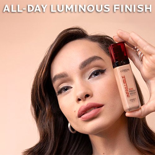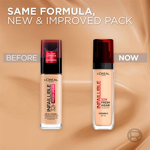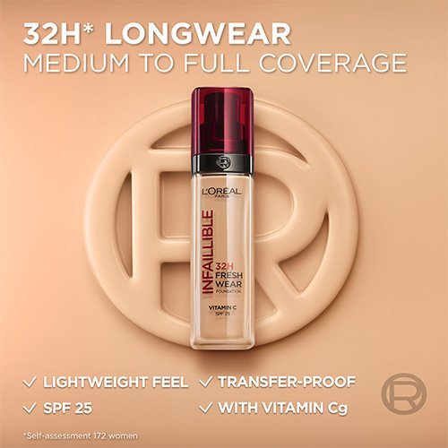 Koe L'Oréal Paris Infaillible 32H* Fresh Wear -meikkivoiteen uusi, entistä parempi koostumus. Nyt koostumuksessa, joka sisältää Cg-vitamiinia ja antaa 32 tuntia kestävän lopputuloksen. Kevyt ja pitkäkestoinen meikkivoide tuntuu keveyeltä iholla ja antaa raikkaan 32 tuntia* kestävän lopputuloksen. Sävy pysyy muuttumattomana koko päivän ajan. Valoa heijastavat mikrohelmet antavat heleän, koko päivän kestävän lopputuloksen ilman, että iho alkaa kiiltää. Cg-vitamiini auttaa lisäämään ihon heleyttä.
